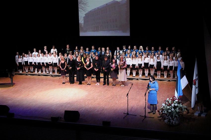 Laupäeval tähistati kooli juubelit Vanemuise kontserdisaalis kontsert-etendusega „Kollase kassi radadel“, millel esinesid kooli koorid, solistid, rahvatantsijad, võimlejad, etlejad ja õpetajad. Omaloomingut esitas vilistlane Malle Pärn, katkendeid vilistlase Mihkel Muti mälestuste raamatust luges kirjandusklassi lõpetanud Mihkel Vetemaa. Vilistlase Hannes Kaljujärve mälestused Vello Saagest kõlasid helisalvestusena. Kontserdi lõpus laulis ühendkoor koos saalisviibijatega Tarmo Urbi loodud koolilaulu.