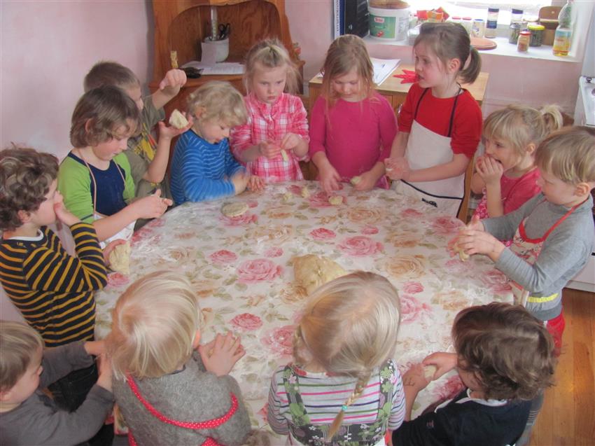 Päev algab hommikuringis laulude, ringmängude, sõrmemängude ning liisu- ja rütmisalmide lugemisega, enne lõunasööki on muinasjuttude jutustamise aeg. Igal nädalapäeval on oma tegevus: esmaspäeval lapsed maalivad, teisipäeval voolivad, kolmapäeval joonistavad, neljapäev on matkapäev, siis minnakse lossimägedesse ja järve äärde, kaasas kodust kaasa võetud võileivad ja soe tee. Reede on küpsetamise päev. Ühekski tegevuseks pole lapsi vaja sundida, piisab sellest, et kasvataja võtab pilli kätte ja hakkab laulma – juba kogunevadki lapsed ringi. Või paneb maalimisvahendid lauale valmis, võtab ka ise pintsli kätte, ja varsti maalivadki kõik.