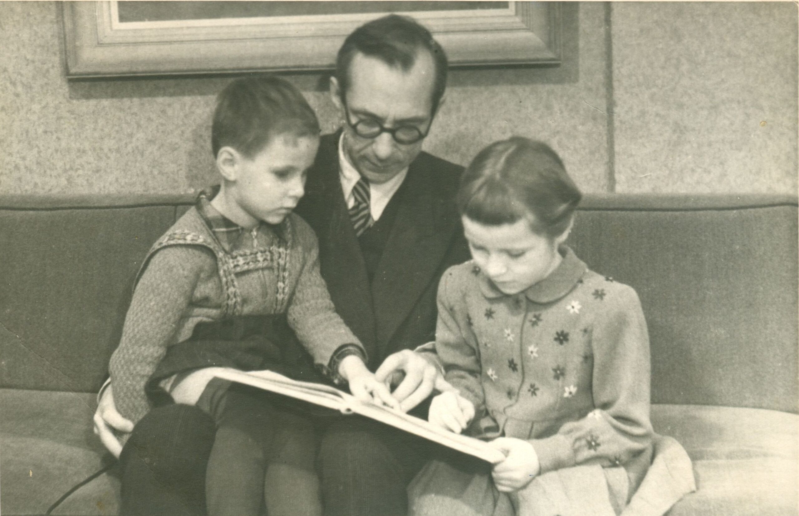 Anu Raud meenutab, kuidas ta iseendal ja vennal juuksetuka lühikeseks lõikas, et tutistada ei saaks. Samast ajast pärit fotol on lapsed koos isa Mart Rauaga oma Tallinna kodus. Pildil on tulevane tekstiilikunstnik viieaastane ja tema vend Annus kolmeaastane. Foto: Uue Kunsti Muuseumi arhiiv