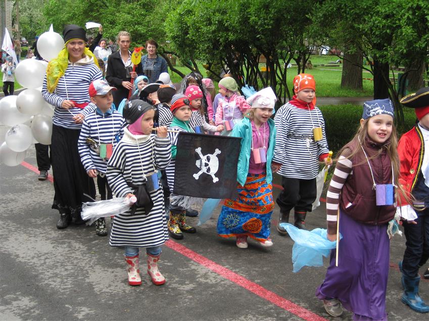 Eve: „Merel seilamiseks ja saarte avastamiseks on vaja binokleid. Rühmaõpetajatete hooleks oli lastele binoklid meisterdada ja koos lapsevanematega mere stiilis riided otsida. Lastel olid vahvad kostüümid, õpetajatel ka. Üks vene õpetaja käis päris madrusesärgis, teine õpetaja tegi ennast Pipiks. Õu oli näkke, madruseid ja mereröövleid täis.”