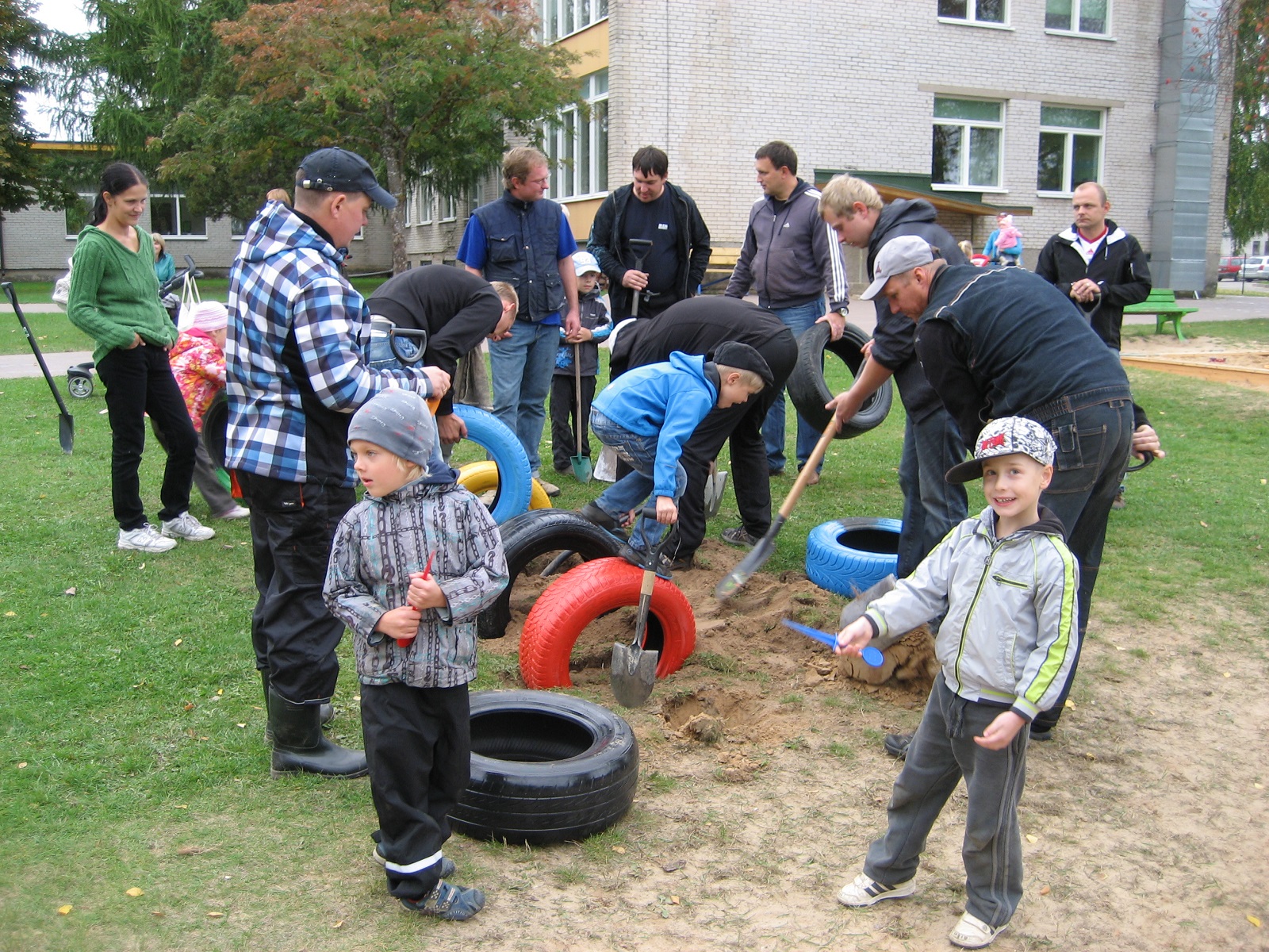 Anne Vanahans ja liikumisõpetaja Silvi Kurg andsid kätte töö õueala mänguväljakutel. Kogu brigaad hakkas tarmukalt tööle – osa isasid kaevas õuemurule auke rehvide paigaldamiseks, osa vanemaid korrastas liivakaste ja ronimisvahendite-alust liivapinda. Hoolekogu esimees Evo Sirendi ühendas kiirelt värvilised kummirõngad kolmeks prügikastiks, et ka õuealal oskaksid lapsed korrast ja puhtusest lugu pidada. Isadele-emadele olid abiks lapsed, kes kaevasid, rohisid koos täiskasvanutega või testisid valminu töökindlust. 45 minutiga valmiski kaks imetoredat ussi. Kui harjutamise käigus tasakaaluhoidmine ja osavus omandatud, pakub mööda kummirõngaid astumine, hüppamine ja alt läbi roomamine lastele palju lusti.