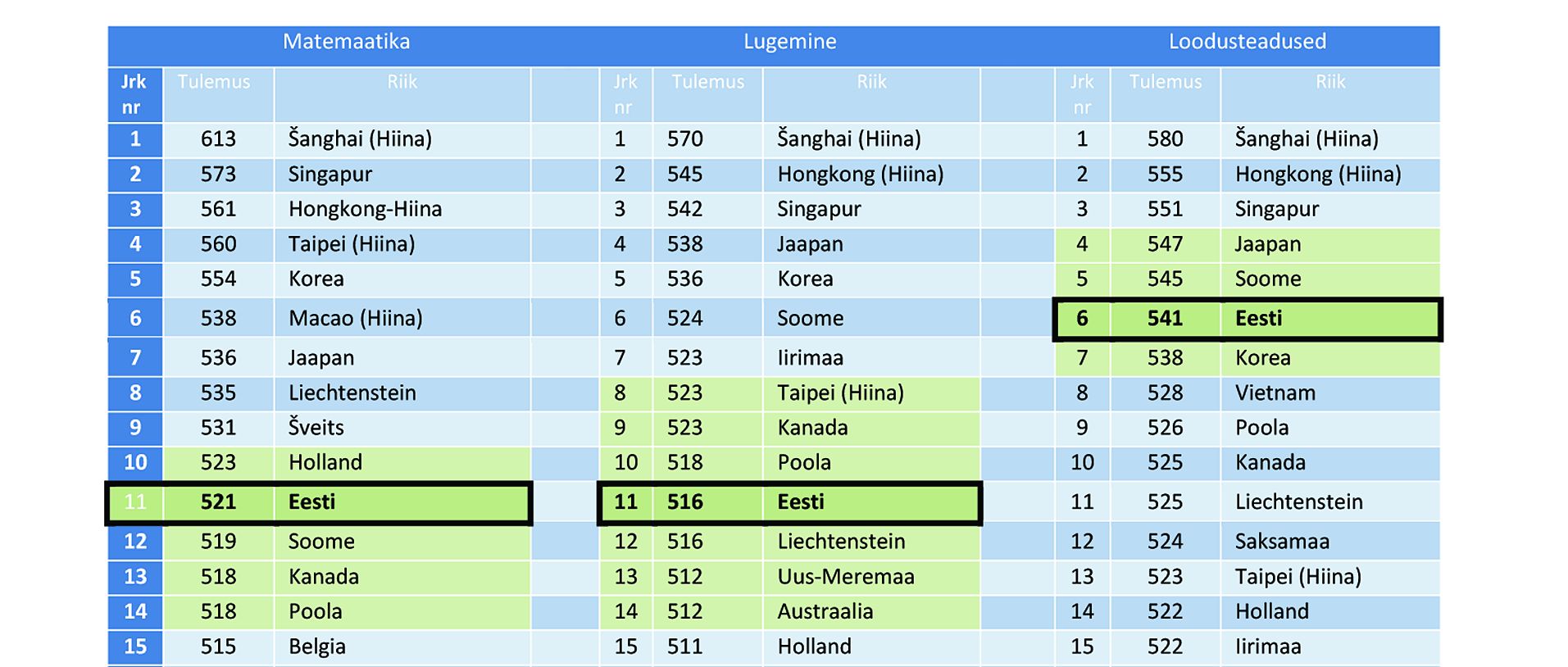 Loodusteadustes jagab Eesti Euroopas auväärset 1.−2. kohta Soomega (maailmas 4.–7. kohta Jaapani, Soome ja Koreaga). Matemaatikas oleme Hollandi, Soome ja Poolaga Euroopas 3.–6. kohal, kusjuures paari punktiga isegi seljatasime põhjanaabrid. Ka funktsionaalses lugemises oleme 3.−6. kohal koos Poola, Liechtensteini ja Hollandiga. Matemaatikas ja lugemisoskuses oleme maailmas üheteistkümnendad.