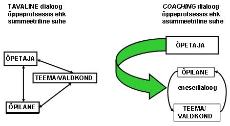 Õpetamisstiili puhul, mida tuntakse coaching’u mõiste kaudu, on kasutusel tehnikad, mille rakendamise tagajärjel saavutatakse olukord, et grupp, aga ka iga indiviid eraldi, avastaks justkui ise nii eesmärgi kui ka selle poole liikumise teed. Selleks tuleb õpetajal osata tekitada grupis ja/või indiviidis „enesedialoog” mingile ülesandele vastuse leidmisel ja siis seda suunata, tuginedes kaasaegsetele teadmistele ja oma kogemustele. Coaching’u keskne idee on oskus osata esitada küsimusi ja väiteid (vt joonis 3).