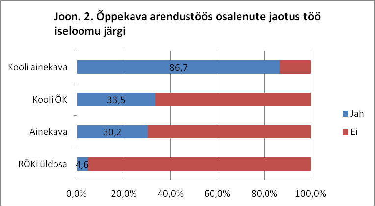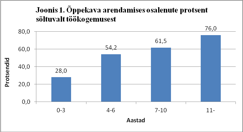 Selle valdkonna küsimustega püüti eelkõige välja selgitada, kuidas õpetajad hindavad oma ettevalmistust õppekava arendustöös osalemiseks, milline on nende kogemus selles ja kuidas nad näevad oma osaluse mõju. 47,5% õpetajatest väitis, et neil on mõningane ettevalmistus, ning 26,5%, et neil on rahuldav ettevalmistus õppekava arendustööks. 11,5% vastanutest väitis, et neil puudub selleks ettevalmistus. Kui arvestada, et õpetajakoolituse esmaõppes õppekava koostamise põhitõdesid üldjuhul ei õpetata, siis on üsna üllatav, et 74% vastanutest leiab, et neil on vähemasti mõningane ettevalmistus. Ligikaudu sama protsent (73%) usutletutest väitis, et nad on osalenud õppekavade arendustegevuses. Kuid osalemine, nagu võiski arvata, olenes kõvasti töökogemusest. Jooniselt 1 on näha, et esimesel kolmel tööaastal osaleb vähem kui 1/3 õpetajatest õppekava arendustöös. Kui aga töökogemus on 11 ja enam aastat, osaleb selles töös üle 3/4 õpetajatest. Analüüs näitas, et see näitaja jääbki ligikaudu samaks ka suurema töökogemusega õpetajate puhul. Kuid endastmõistetavalt sõltub arendustöös osalemise protsent sellest, millise tasandi õppe- või ainekavaga on tegemist. Vastavad näitajad õppekavaarenduses osalenud õpetajate kohta on esitatud joonisel 2. Kui RÕK-i üldosa arendamises väitis end osalevat vähem kui 5%, siis kooli ainekava arendusega tunneb end olevat seotud peaaegu 87% õpetajatest.