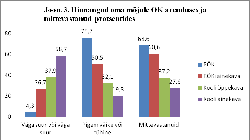 Üsna kõnekaks osutusid küsitletute hinnangud ka oma mõjule eri tasandi õppekavade arendustöös (vt joon 3). Ilmselt küsimuse ebamugavusest tingituna jättis suur osa usutletutest (68%) üldse hindamata oma mõju RÕK-i üldosa kujunemisele. Vastanutest väitis 4,3% (kõigist usutletutest vaid 1,4%), et neil on olnud suur või väga suur mõju. Seevastu ligi 76% väitis, et see mõju on pigem väike või tühine. 20% õpetajatest ei avaldanud oma arvamust. Kooli ainekavade osas on asi muidugi parem, sest peaaegu 59% vastanutest (kuid vaid 42,5% kõigist usutletuist) väitis, et neil on suur või väga suur mõju kooli ainekavade koostamisele. Siiski hindas ligi 20% õpetajatest oma mõju tühiseks. Kokkuvõttes ei tunne ligikaudu 57% usutletutest suure tõenäosusega ka oma ainekavade suhtes omanikutunnet.