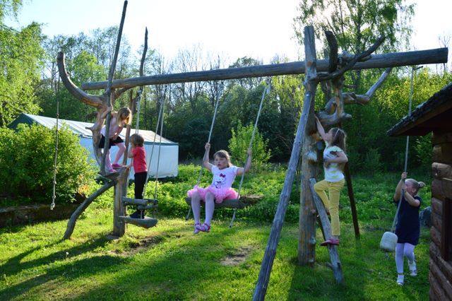 „Karu-aabitsast” tuttavad tegelased. Pidu mindi pidama Palade külla Soera talumuuseumi, kus sai ka kiikuda ja mängida (paremal). Fotod: Kärdla lasteaed