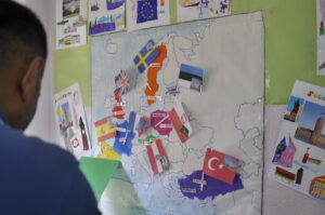 Kõige raskemaks pähkliks osutus ka 3. ja 4. klassile riikide ning nende lippude järjestamine valmival plakatil. Helenile (1. kl) satub loosiga Poola. „Mis on Poola pealinn?” küsib ta valjult. Läheb siis ise tahvlil rippuva maakaardi juurde, otsib riigi üles, vaatab sellel ka Poola lippu ning läheb pinki seda värvima.