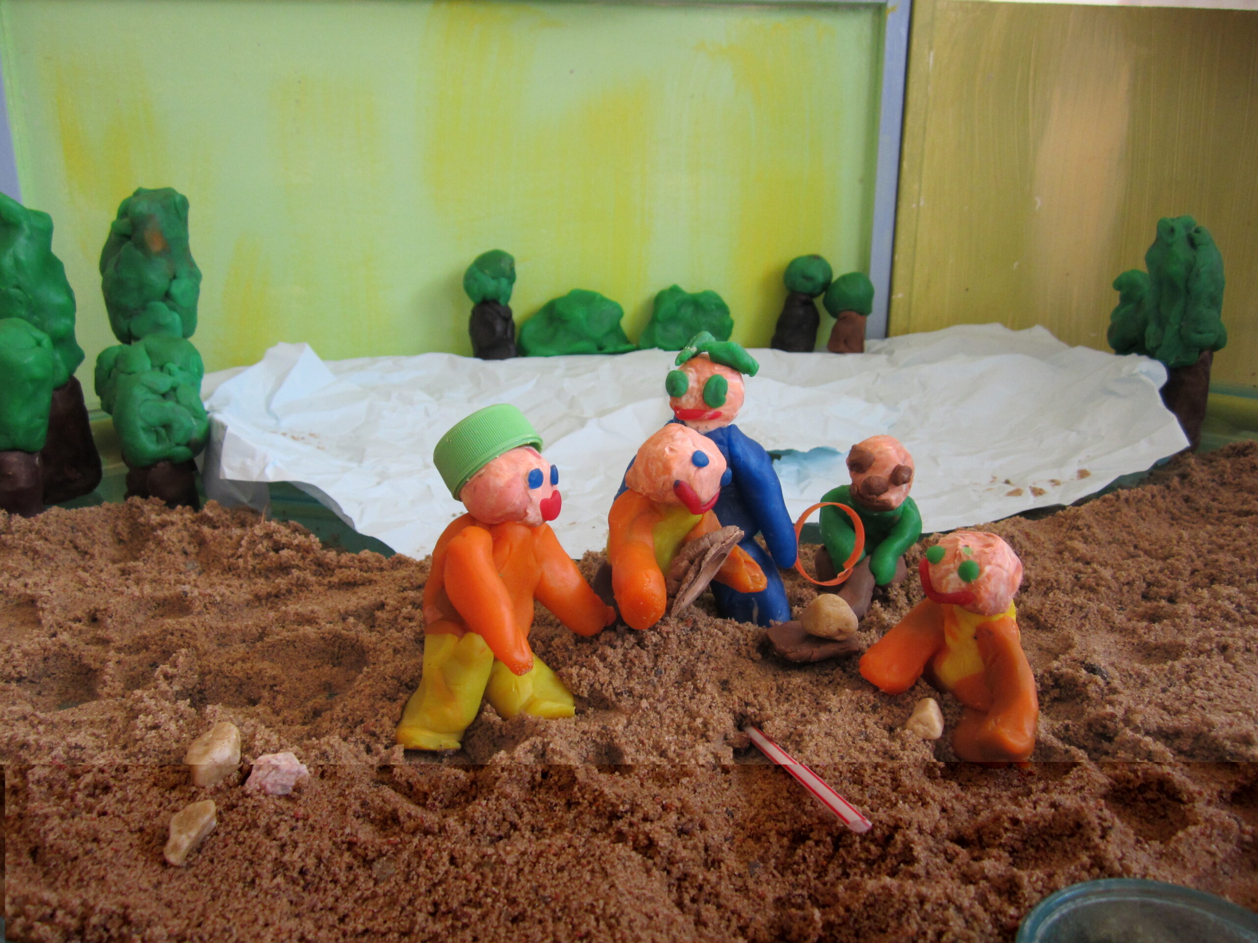 Esimene multifilm oli „Aaretejaht”. Meil oli aarete otsimise nädal ja käisime Harku järve ääres vaatamas, mida liiva seest leiab. Juhtumisi tegutses seal parajasti ka metallidetektoriga mees. Leidsime põhiliselt pudelikorke ja muud prahti, ka mõne mündi, ning tegime sellest multifilmi. Panime liiva alusele, tegime paberist sinise järvekese, voolisime inimesed, kes käisid järve ääres aardeid otsimas ja leidsid neidsamu asju, pudelikorgi ja mündi, ning viisid need ära.