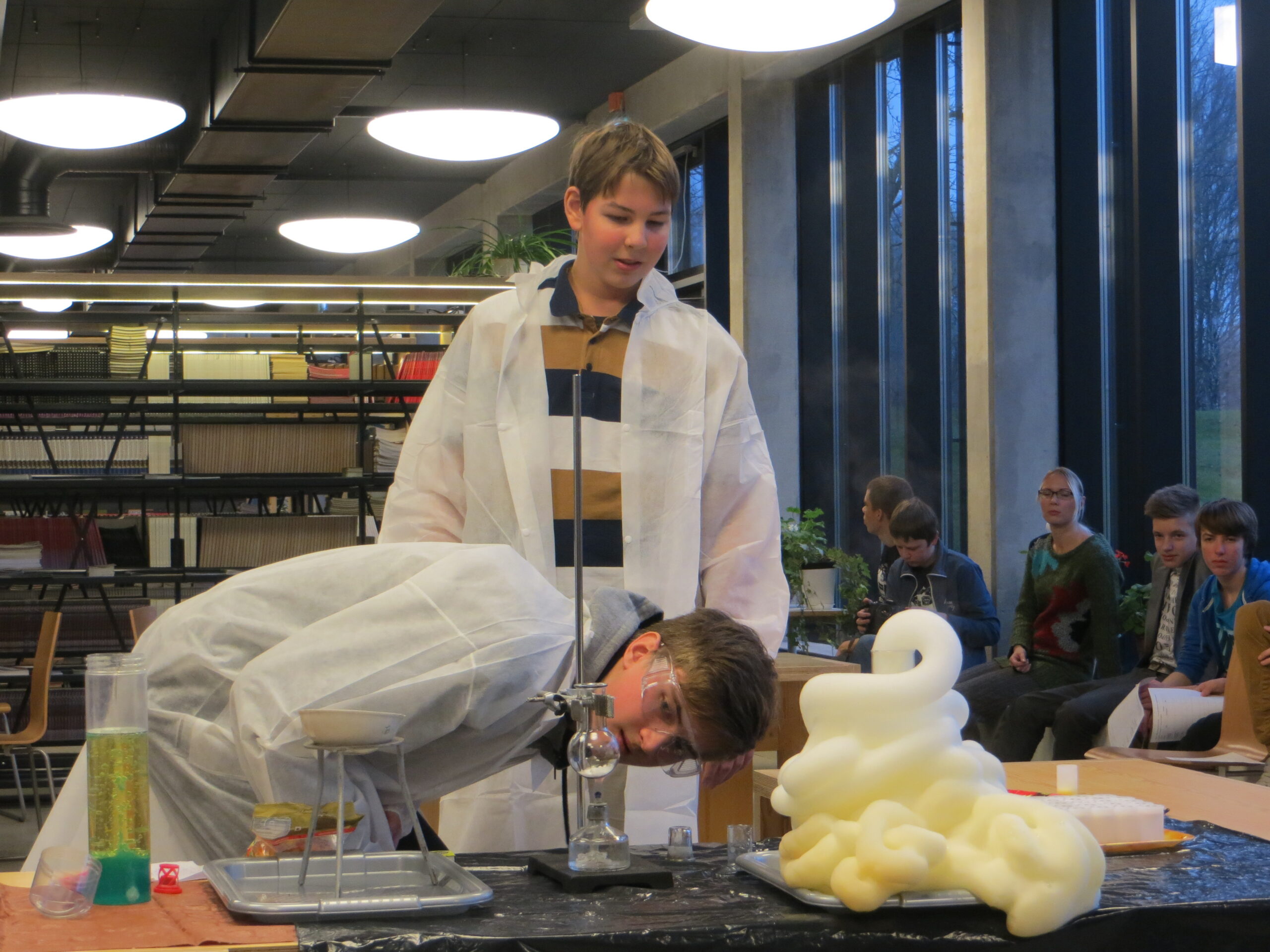 „Ohtlikud asjad olime sunnitud koju jätma,” ütlesid Saaremaa ühisgümnaasiumi õpilased Andres Rüütel ja Magnus Kaldjärv oma esinemisnumbrite sissejuhatuseks. Kaasas polnud ka kolmandat kaaslast, kes keemiakatseid teeb. See-eest oli mere tagant kaasa toodud uhiuus vaakumimasin, mis paisutas kupli all vahukommid hiigelsuureks, ja palju elevust tekitanud mullimasin.