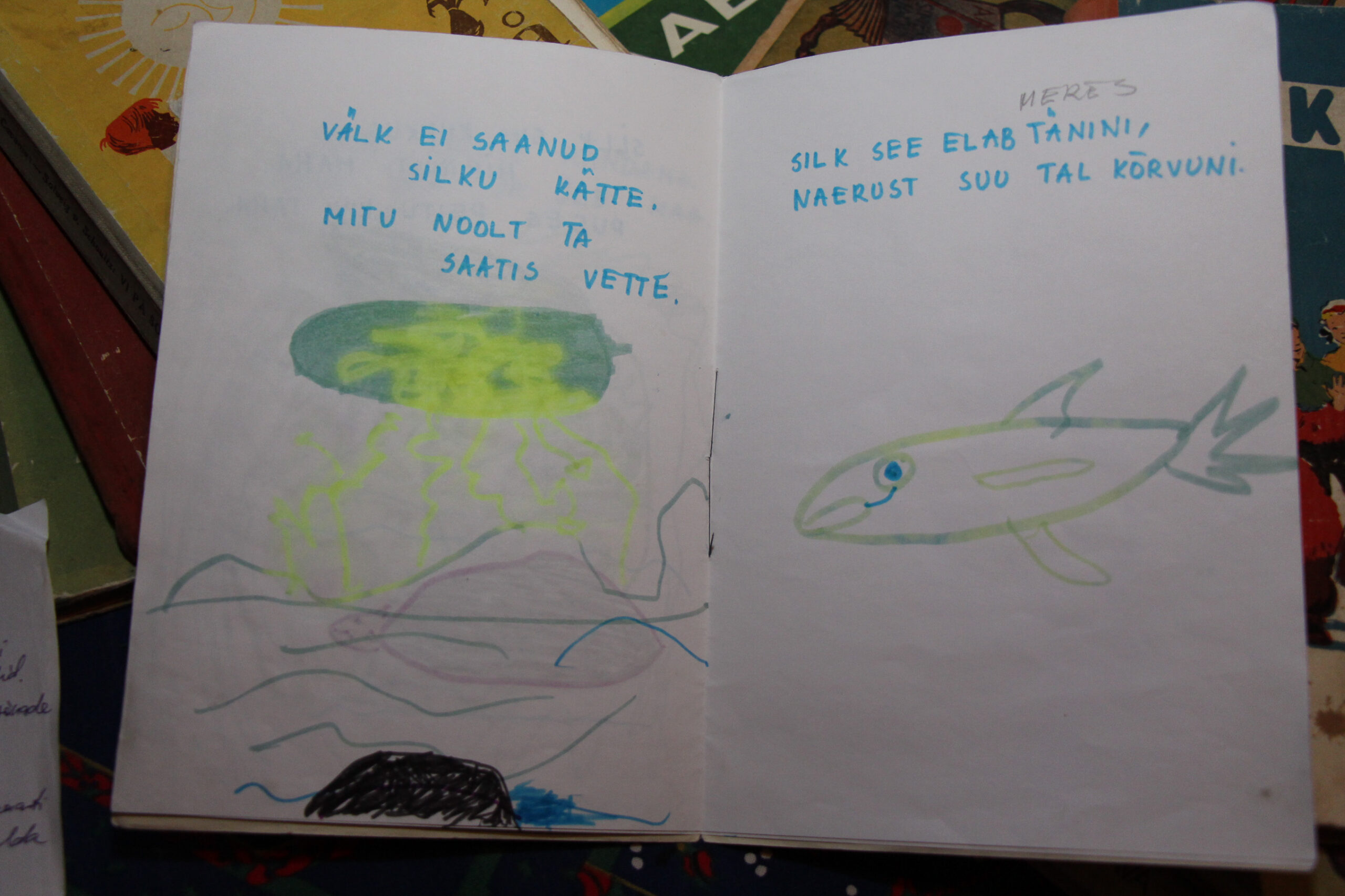 „Silk ja välk”, luges ja joonistas Sander, idee Sander; kirjutas vanaema. Raamat algas nõnda: