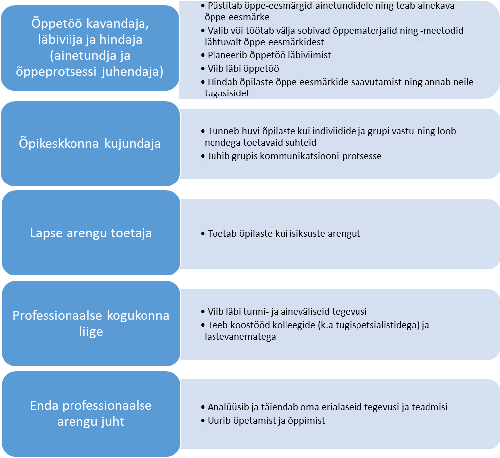 Eesti ja Hollandi teadlaste loodud hindamismudel koosnes esialgu viiest õpetajatöö rollist, üheteistkümnest professionaalsest tegevusest ja iga tegevuse neljast tasemest. Tasemete sõnastamisel lähtuti järgmistest printsiipidest.