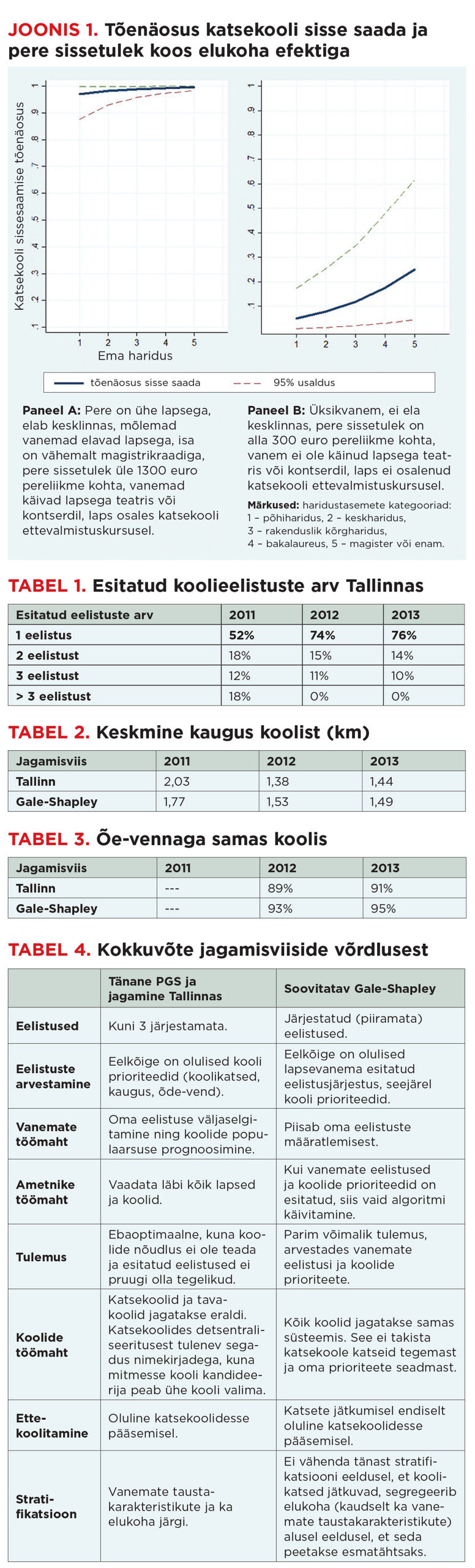 Osaliselt on arusaadav, miks Tallinnas lubatakse esitada vaid kuni kolm alternatiivi. Käsitsi on ligikaudu 4000 õpilast koolidesse raske jagada ning pikad eelistusnimekirjad muudavad selle veelgi keerukamaks. Kui on aga olemas kogu info eelistuste, õdede-vendade ja kauguste kohta, ei ole mingit põhjust, miks ei võiks jagamist automatiseerida. Gale-Shapley võtab parimal võimalikul viisil arvesse vanemate eelistused ja õiguse (kauguse ning õe-venna näol) kooli pääseda ning garanteerib jagamise, kus on põhjendatud mõnda kooli mittesaamine: teistel lastel õppis samas koolis õde või vend või elasid nad koolile lähemal. Samas ei tohi ära unustada ka õiglust koolide prioriteetides. Kui praegu registreerivad vanemad ennast mõnda koolilähedasse korterisse koolikoha saamiseks, ei tundu see õiglane. Ei tohi unustada, et elukohajärgsus võib samuti olla segregeeriv. Tabelis 4 oleme kokkuvõtlikult esitanud kahe süsteemi võrdluse.