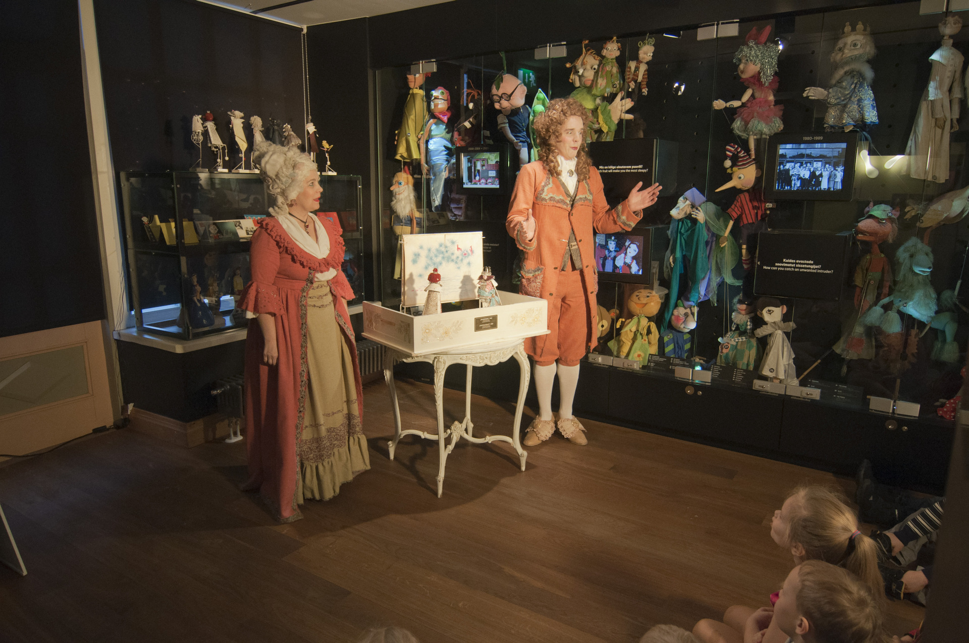 Ekskursioonid tutvustavad lastele ja täiskasvanutele nukuteatri ajalugu ja varjuteatrit. Tutvustavaid tekste saab lugeda ka ekraanidelt. Valid keele – eesti, inglise, vene või soome – ning profiili – täiskasvanu või laps. Ühel ekraanil on juhuslikult lahti valik: Eesti teatrid. Valid teatri ja teed seal virtuaalse tuuri. Esimene mõte on, et vaatad turvakaamerat. Ei olevat inimest, kes ei küsi, kas see on otsepilt. Selle ekraani ees on inimesed olnud paar tundi ja lubanud tagasi tulla, sest palju jäi nägemata ja lugemata. See sobib hästi neile, kes otsivad konkreetset materjali. Näiteks teevad koolis uurimistööd.
