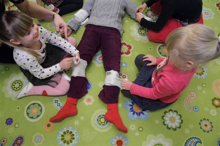Liikumistegevuste ajal võib komistada nii võimlemismati taha kui ka pallile, millega näidatakse lastele liikumisharjutusi ette. Kord juhtus, et koolieelikute rühmas liikumistegevust läbi viies näitas õpetaja lastele ette esemest ülehüppamise tehnikat ning rebestas maandudes säärelihase.
