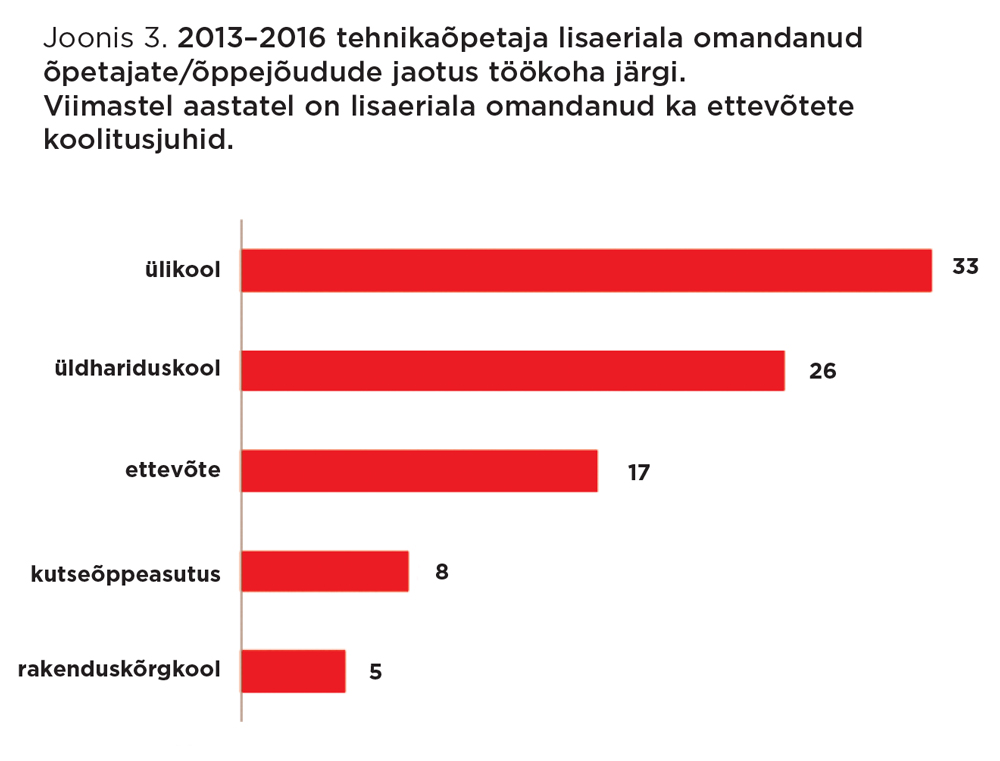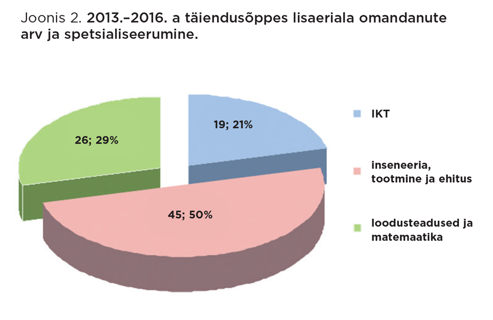 Täiendusõppes on tehnikaõpetaja lisaerialal võimalik valida järgmiste spetsialiseerumiste vahel: inseneeria, tehnika ja tootmine; info- ja kommunikatsioonitehnoloogia; loodusteadused ja matemaatika (joonis 2). Täiendusõppes osalenud õpetajatest oli aastatel 2013–2016 40% mehi ja 60% naisi, õppejõududest oli mehi 58% ja naisi 42%.