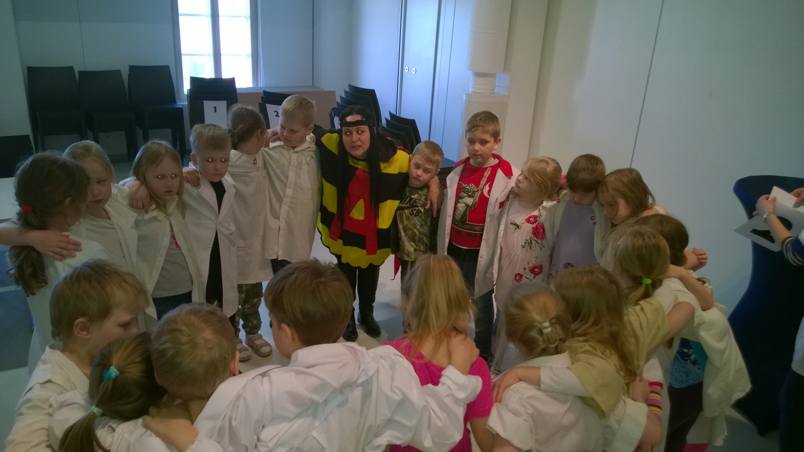Edasi moodustasime kaptenite abiga neli meeskonda. Iga grupi juures abistas lapsi üks täiskasvanu. Härra Kask sai grupi, kelle ülesanne oli mõõta, mitu tooli mahub laua äärde. Mõõtmisvahenditeks valiti harilikud pliiatsid. Üks tool oli kaks pliiatsit lai, nii selgitasid nad välja, et ühe laua taha mahub kaheksa tooli. Kuna saalis viibis 22 last, siis aitas muuseumipedagoog lastel edasi arvutada. Selgus, et kõik lapsed mahuvad istuma kolme laua äärde.
