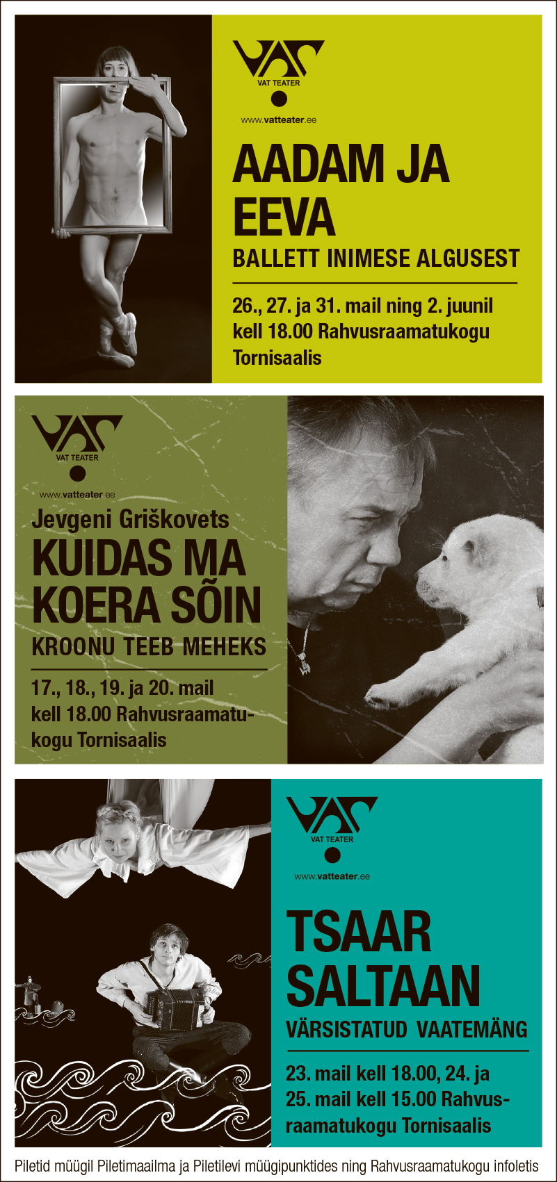 Mai lõpus ja juuni alguses etendub Tornisaalis VAT Teatri ballett „Aadam ja Eeva”.