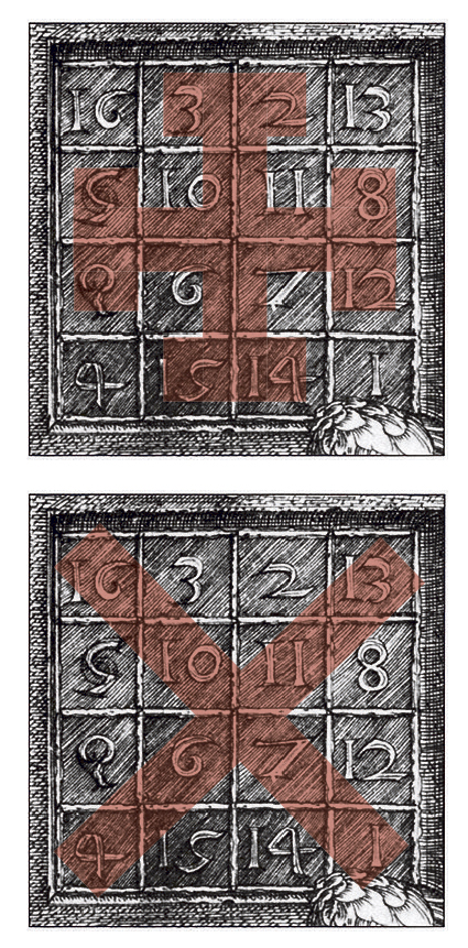 Maagilise ruudu igas reas, nii piki- kui ka põikiridades ja diagonaalides tuleb kokku üks ja sama summa: 34. Kvadraat koosneb ühtlasi viiest nelinurgast (keskel ja igas neljas nurgas), mille numbrid annavad kokku samuti 34. Sama lugu on kvadraadi keskmesse moodustuva võrdhaarse risti kummagi haara otsapunktide summaga (3 + 2 + 15 + 14; 5 + 9 + 8 + 12). Tähelepanelik vaataja leiab samuti, et ka maagilise ruudu otstes paiknevad numbrid moodustavad sama summa.