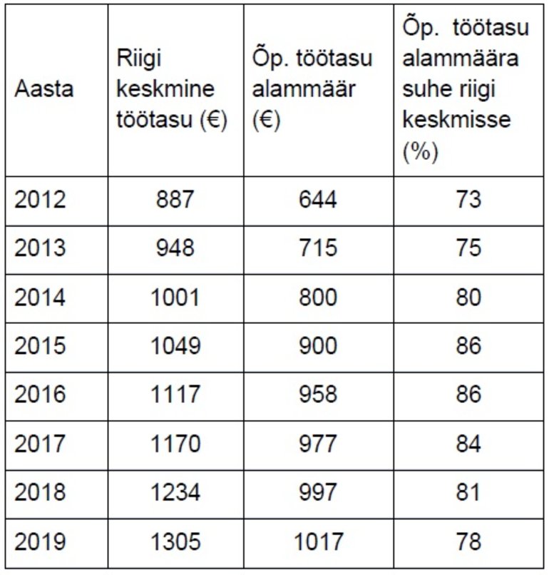 Elukestva õppe strateegia, mis on riiklik hariduse arendamise alusdokument, ütleb: „Eesmärk on õpetaja ameti kujundamine selliseks, et koolis töötamine muutub arvestatavaks valikuks parimatele. Õpetaja keskmine palk tuleb tõsta tasemele, mis on võrdne Eestis töötava kõrgharidusega spetsialisti keskmise palgaga.“ Selle spetsialisti keskmine töötasu ongi 120% üldisest riiklikust palgast. Eesti õpetaja on magistriharidusega spetsialist, kuid täiskoormusega töötades garanteerib riik käesoleval aastal õpetaja töötasuks 958 eurot, mis moodustab riigi keskmisest (mitte kõrgharidusega töötajate keskmisest) palgast vaid 86%.
