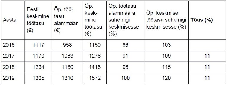 Et puutume õpetades kogu aeg noortega kokku, teame, et eesmärke on lihtsam täita, kui keeruliste otsuste tegemisel on keegi abikätt ulatamas. Meie ulatame oma abikäe hea meelega alloleva tabeli näol, kus on ära toodud õpetajate töötasu vajalikud tõusud järgmisel kolmel aastal, et jõuaksime valitsuse seatud eesmärgini – et õpetaja saaks keskmiselt sama palju tasu oma töö eest kui iga teine kõrgharidusega spetsialist Eestis.