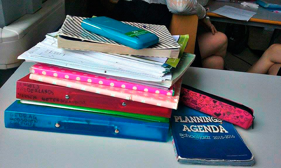 Kui Eestis on iga aine jaoks eraldi õpik, mitu vihikut pluss veel töövihik, siis Belgias jagatakse suurem osa materjalist välja paberilehtedel, mille õpilased ise kaustadesse sorteerivad. Osas ainetes on õpikud ka, kuid neid väga ei kasutata. Eraldi vihikute asemel on kõigil üks suur plokk, kuhu vajadusel märkmeid kirjutatakse, ning hiljem leiab see üksik paberileht loodetavasti vastava aine kaustas endale koha. Enamasti on õpetajad valmistanud iga tunni jaoks PowerPointi esitluse, mille nad siis tunnis ette kannavad ja ise sinna juurde räägivad. PowerPointi ja õpetaja jutu järgi peame töölehti täitma või märkmeid tegema.