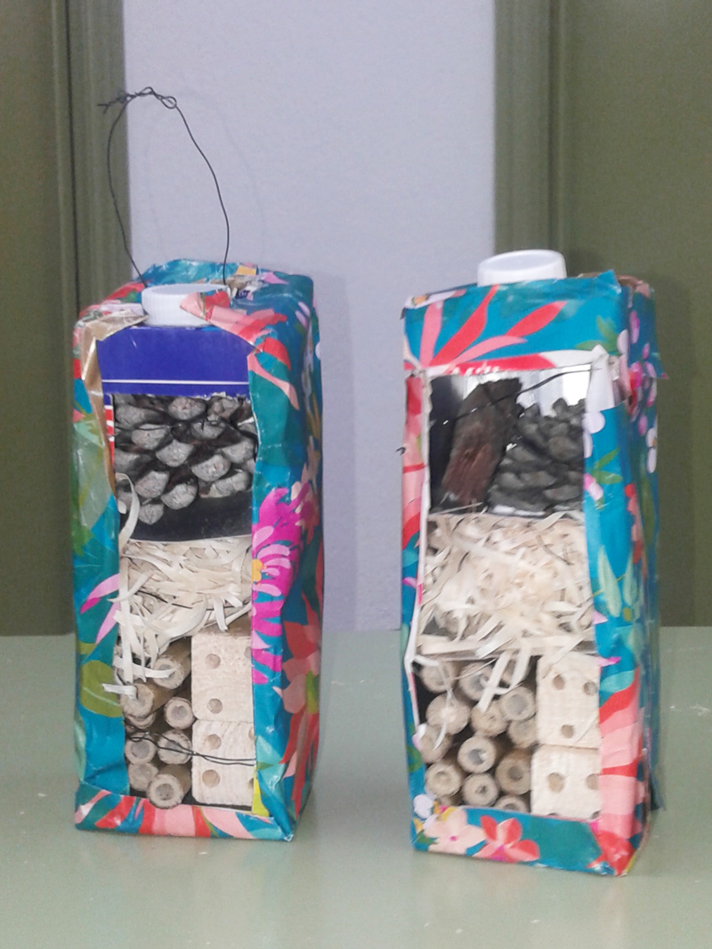 Koolis tegime endale kõigepealt nimesildid. Seejärel hakkasid töötoad. Esimene oli Saksa oma. Tegime putukate hotelli. Mahlapakki lõigatakse auk, siis pannakse sinna sisse puulaaste, bambust, käbisid. Kui putukate hotell nüüd aeda viia, saavad putukad seal elada.