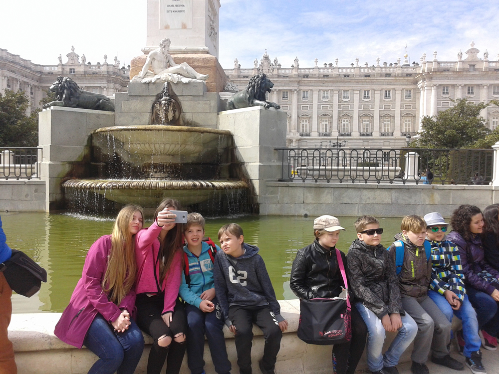 Ekskursioon Madridis. Purskkaev, mida olevat aidanud konstrueerida Galileo Galilei ise. Saksa lapsed teevad pilti, nende kõrval istuvad Maarja-Magdaleena põhikooli õpilased Maarja Katariina Kerge, Henri Poolak, Romeo-Rasmus Kangur ja Joosep Treier. Foto: Kirsti Kadaja-Prodanets
