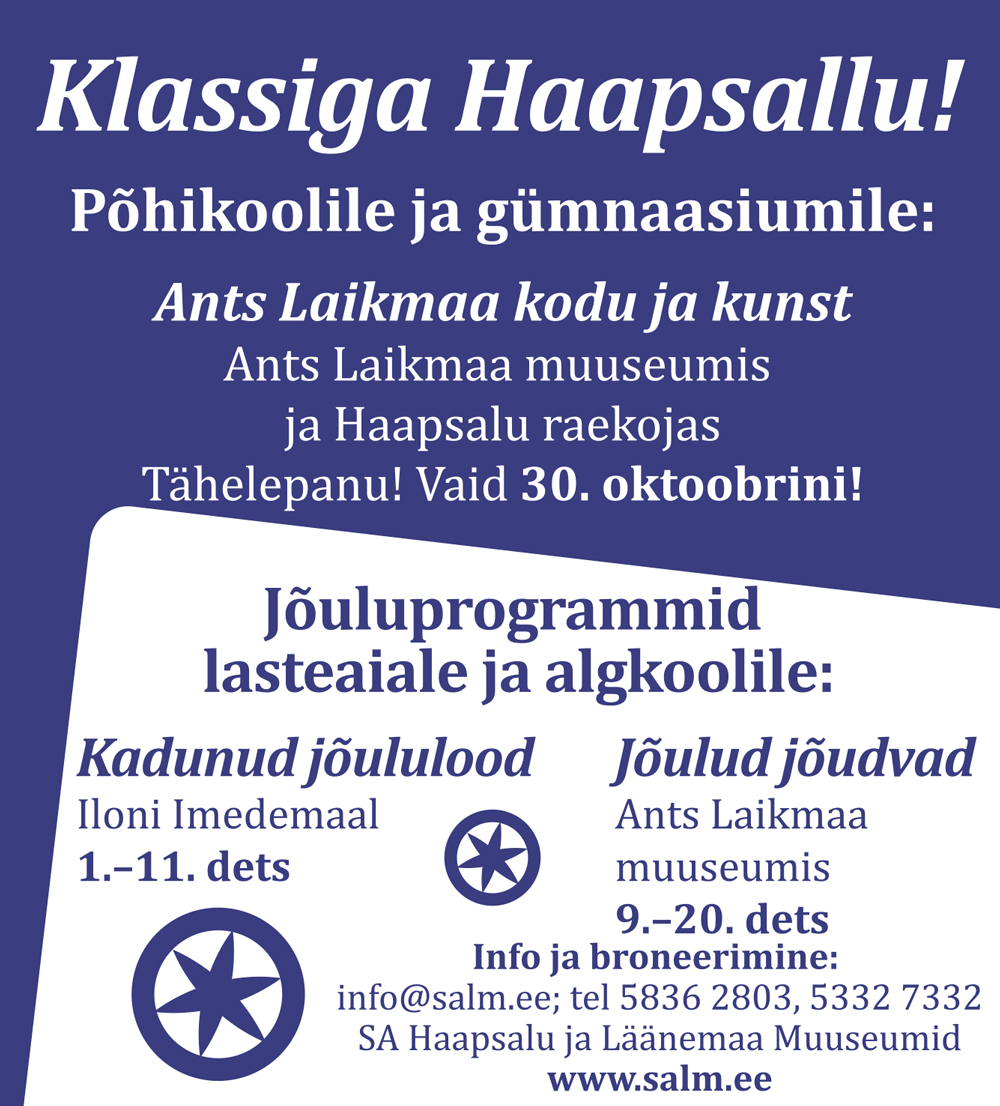 Seega julgustan teid alanud õppeaastal kindlasti Haapsallu tulema. Tallinnast oleme ju vaid pooleteise tunni pikkuse bussisõidu kaugusel. Kohtumiseni Haapsalu muuseumides!