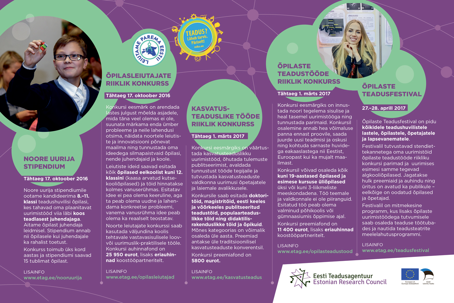 Septembri lõpus kuulutati välja avatud taotlusvoor „Teeme+”, kust ühe võimalusena saab teadushuviringide tegevuse käivitamiseks ja läbiviimiseks toetust taotleda. Kogu vooru eelarve on 1,5 miljonit eurot, taotluste esitamise tähtaeg 28. november. Ühe taotluse eelarve peab jääma vahemikku 10 000–100 000 eurot, taotlejalt oodatakse 15% omafinantseeringut. Kontakt ja täpsem info: http://archimedes.ee/str/taotlejale/periood-2014-2020/teeme/.