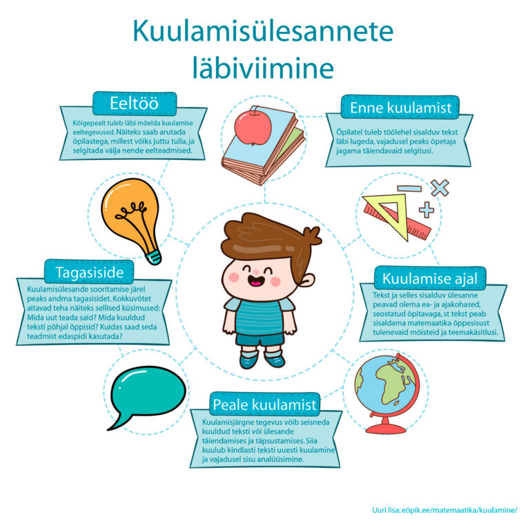 Õpilane keskendub kuulamisülesandele, õpib kuuldut analüüsima, eristab matemaatika mõisteid, tõlgendab ja kasutab neid ülesande sooritamisel. Kuulamisülesannete läbiviimiseks matemaatikatunnis on mitmeid võimalusi. Esmakatsetuste tegemisel on soovitav tugineda keeleõppes rakendatavale metoodikale, kus kõigepealt tuleb läbi mõelda eelnev tegevus. Selleks sobib teemast tulenev ennustamine, st arutleda õpilastega, millest võiks juttu tulla, või õpilaste eelteadmiste väljaselgitamine, samuti kuulamisülesandeks vajaliku materjali väljalõikamine, lauale paigutamine või vajaliku töölehega (skeemi, pildimaterjali ja sisuga) tutvumine. Järgneb töölehel sisalduva teksti läbi lugemine, vajadusel õpetaja täiendavate selgituste lisamine. Eeltegevused peavad sisaldama täpseid ja üheselt mõistetavaid töökorraldusi, mida õpilane kuulamise ajal tegema/täitma peab.