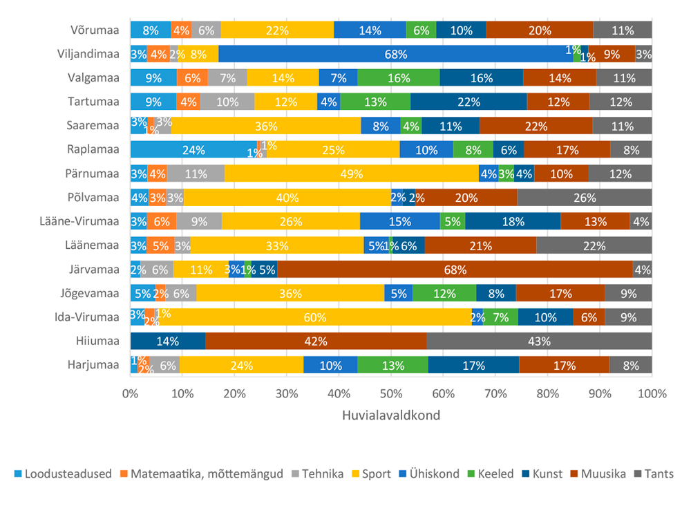 Uuring näitab, et üle kogu Eesti on noortele kõige kättesaadavamad huvialad kaunid kunstid ehk muusika, tants ja kunst, samuti sport. Vähem tegelevad noored matemaatika ja tehnikaga.