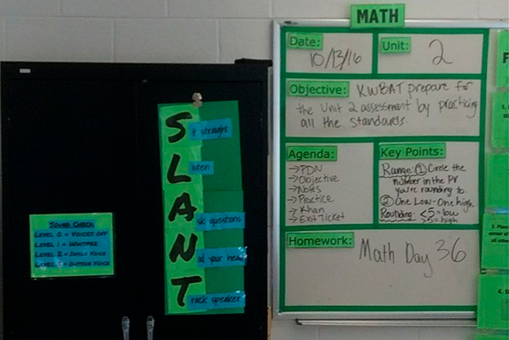 SLANT on akronüüm sõnadest Sit up straight – istu sirgelt; Listen – kuula; Ask questions – esita küsimusi; Nod your head – nooguta pead; Track the speaker – jälgi kõnelejat. SLANT-i mõtlesid välja juba kooli asutajad, sest seda kasutades on õpilasel kergem tunnist osa võtta. Õpilane saab õpetajast paremini aru ja õpetaja näeb selgemini, kas õpilane võtab tunnist osa.
