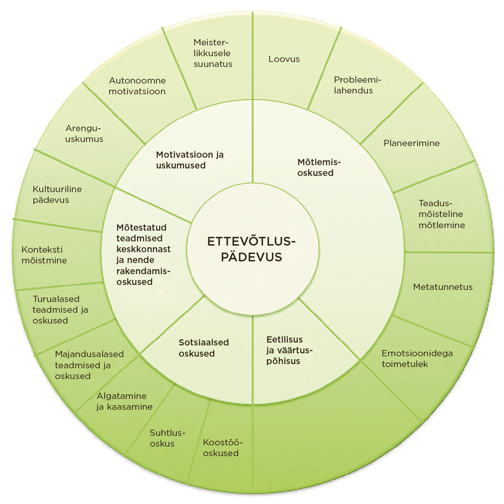 Urve Venesaar: Oleme ettevõtluspädevuse mudelisse pakkunud viis valdkonda: motivatsioon ja uskumused, mõtlemisoskused, sotsiaalsed oskused, mõtestatud teadmised keskkonnast ja nende rakendamisoskus ning eetilisus ja väärtuspõhisus. Need valdkonnad koosnevad omakorda 17 alapädevusest (nt motivatsioon ja arenguuskumus, loovus, algatus- ja koostöövõime, suhtlemine, teadmised turust ja rahandusest jm).