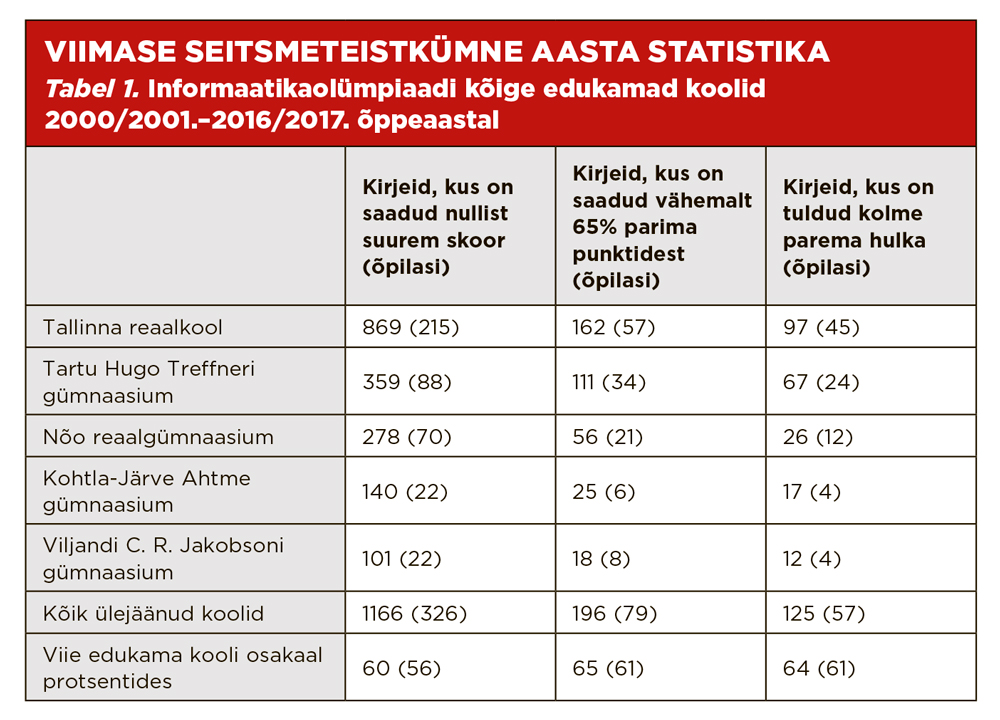 Alates 2000/2001. õppeaastast on informaatikaolümpiaadil osalenud ja saanud vähemalt ühes voorus nullist suurema skoori 734 õpilast. Üksikuid silmapaistvaid osalejaid leiab paljudest koolidest, kuid koole, mis on edukad aastast aastasse ja kust on tulnud ridamisi edukaid õpilasi, on vaid üksikud. Teistest eristuvad viis kooli: Tallinna reaalkool, Tartu Hugo Treffneri gümnaasium, Nõo reaalgümnaasium, Kohtla-Järve Ahtme gümnaasium ja Viljandi C. R. Jakobsoni gümnaasium. Nendest on tulnud pea kaks kolmandikku informaatikaolümpiaadidel edu saavutanud õpilastest.