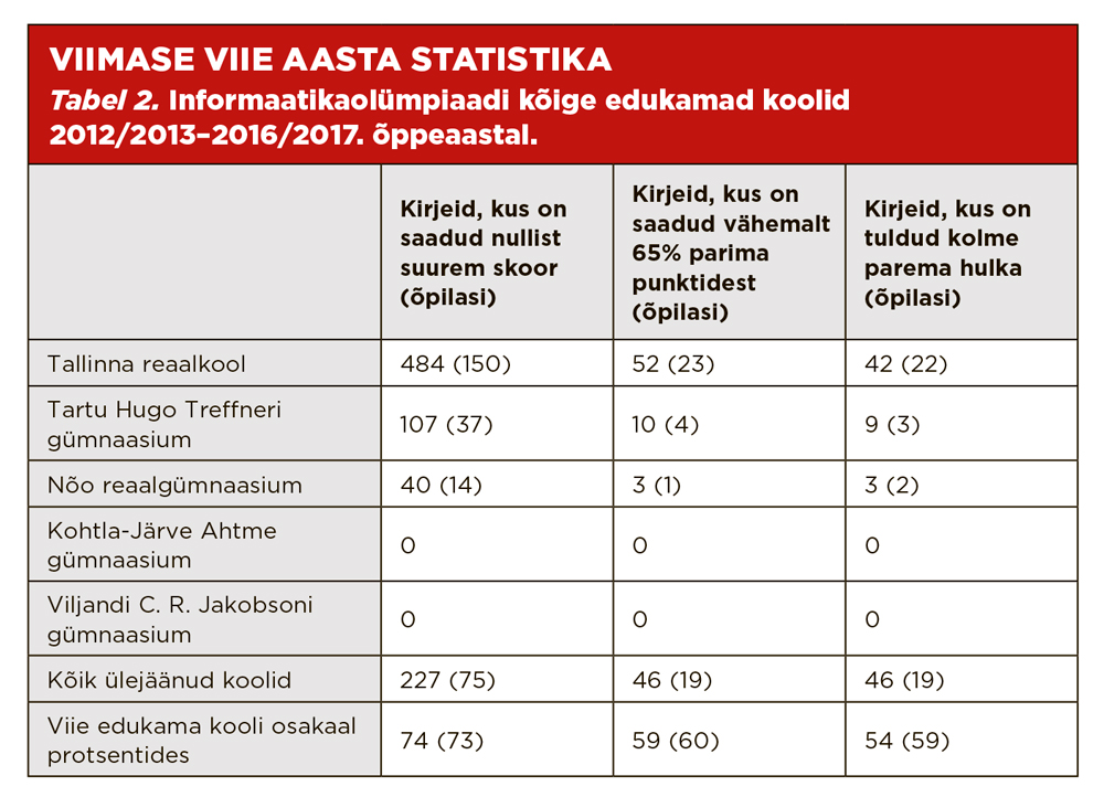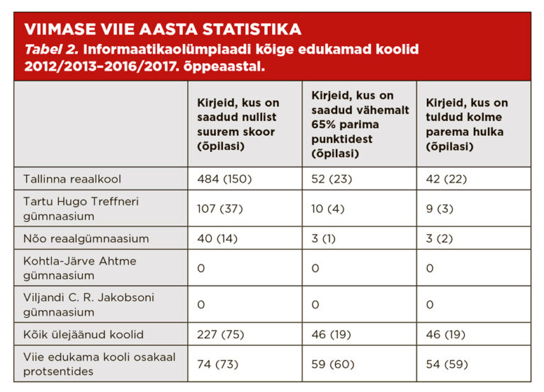 Kui vaadata viimast viit õppeaastat (2012/2013–2016/2017), on edukate koolide hulk veelgi vähenenud (vt tabel 2). Kohtla-Järve Ahtme gümnaasium ja Viljandi C. R. Jakobsoni gümnaasium on pildilt sootuks kadunud, Nõo reaalgümnaasiumi edu jäänud tagasihoidlikuks, seevastu Tallinna reaalkoolist tulevad juba umbkaudu pooled informaatikaolümpiaadil silmapaistnutest. Aastal 2012 muutus C. R. Jakobsoni gümnaasium põhikooliks ja mitme gümnaasiumi peale loodi Viljandi gümnaasium, kuid selle osalus ja edu informaatikaolümpiaadil on olnud tagasihoidlik. Ahtme gümnaasium tegutseb jätkuvalt, kuid osales olümpiaadil viimati 2008/2009. õppeaastal.