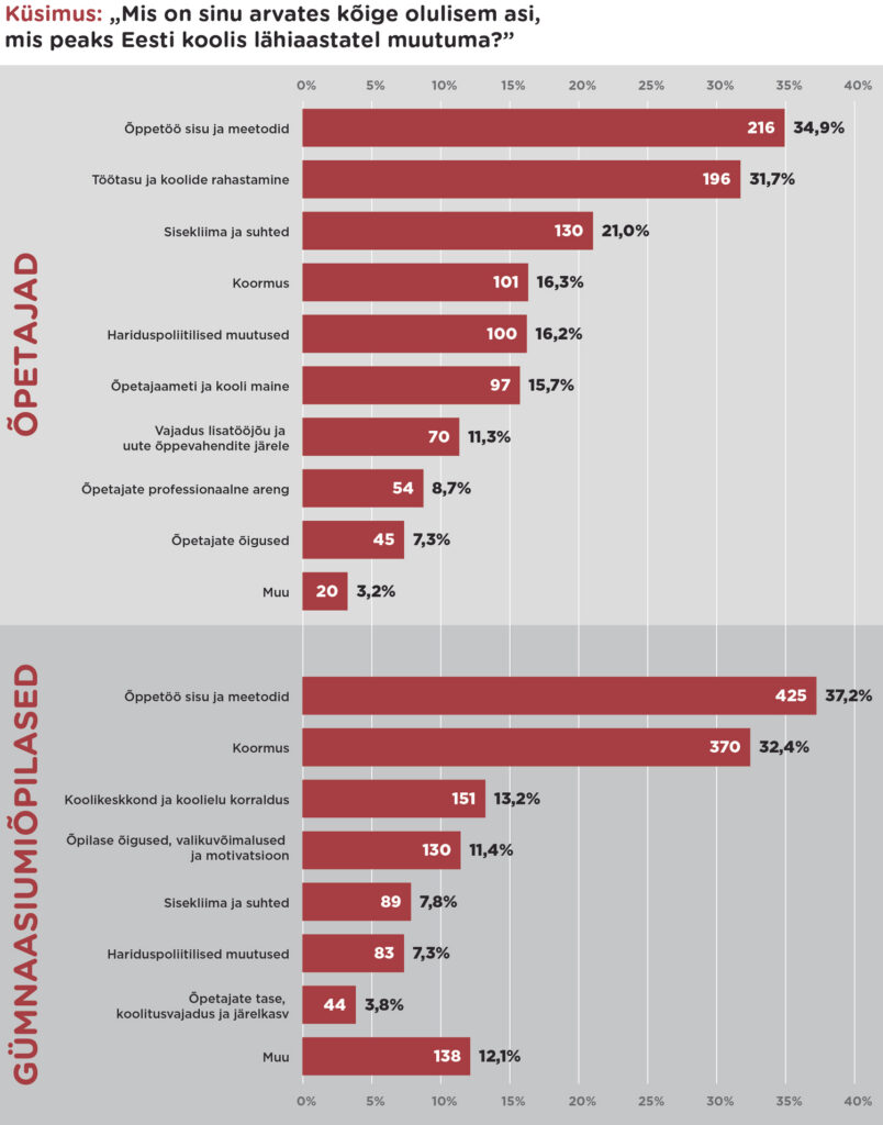 Eesti hariduselu keskmesse on tõusnud muutused – avalikus debatis oodatakse paremat palka õpetajale ja rohkem koolirõõmu õppurile, õpetaja­ameti maine tõusu ja digipööret, uut õpikäsitust ja vähem koolistressi. Milliseid muutusi aga Eesti õpetajad ja õpilased ise koolilt ootavad? Tallinna ülikooli haridusinnovatsiooni keskus viis 2016. aasta kevadel läbi uuringu, milles Eesti üldhariduskooli õpetajad ja õpilased vastasid ka küsimusele „Mis on kõige olulisem asi, mis peaks Eesti koolis lähiaastatel muutuma?”. Küsitluses osales 800 õpetajat ja 1200 õpilast 32 koolist.