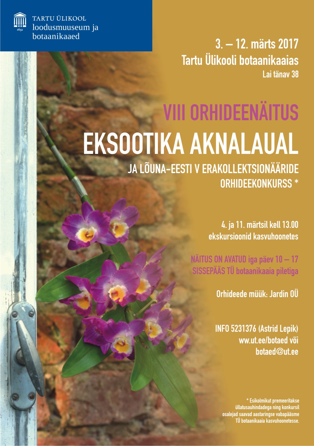 Orhideenäitus „Eksootika aknalaual” on avatud 3.‒12. märtsini iga päev kella 10‒17 Tartu ülikooli botaanikaaias aadressil Lai 38. Huvilistele toimuvad 4. märtsil ja 11. märtsil kell 13 temaatilised ekskursioonid botaanikaaia kasvuhoonetes. Näitust saab külastada ja ekskursioonidel osaleda botaanikaaia piletiga.