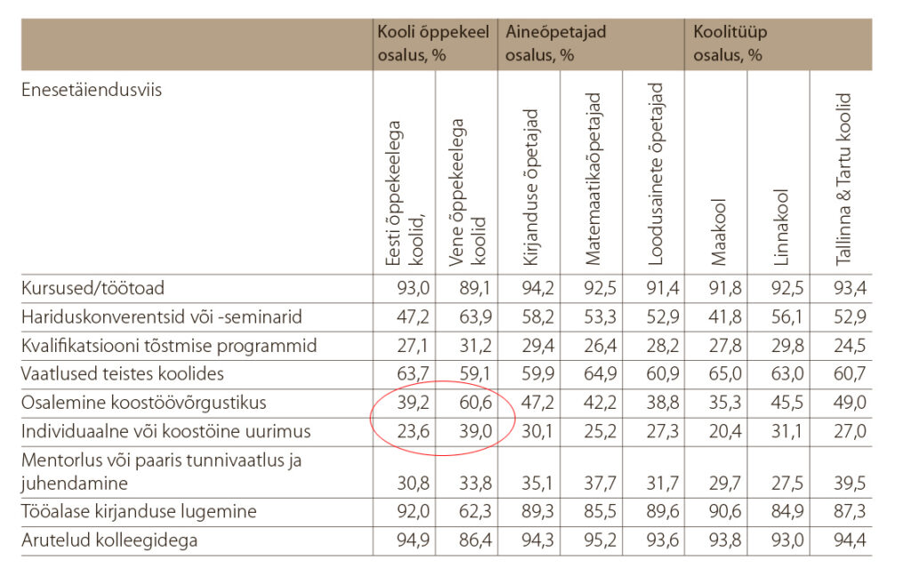 TALIS 2013 uuring näitab, et enda hinnangul täiendavad Eesti õpetajad kõige sagedamini end kolleegidega arutledes, kursustel ja töötubades ning tööalast kirjandust lugedes. Arutelud ning kursused-töötoad on sageli koostöise õppimise vormid. Samas ei pööra me piisavalt tähelepanu sellele, kuidas ühist õppimist rohkem toetada. Tööalase kirjanduse tähendus vajab lähemat selgitamist. Loodetavasti ei ole see pelgalt õppekirjanduse ja Õpetajate Lehe lugemine ning iga õpetaja saab öelda, et on viimase aasta jooksul ka paar teadusartiklit läbi lugenud. Eesti keeles on meil selleks Eesti Haridusteaduste Ajakiri (http://eha.ut.ee), aga tohutult avardab vaadet ingliskeelsesse ruumi sisenemine. Kui foorumi 250 inimeselt küsiti, kes neist on lugenud midagi õpetajahariduse ühelt suurimalt uurijalt Lee Shulmanilt või Hollandi haridusedu suunanud ja praegu Tartu ülikooli külalisprofessorina töötavalt Robert-Jan Simonsilt, ei tõusnud saalis ühtegi kätt. Õnneks oli rohkem inimesi kuulnud John Hattiet või lugenud tema artikleid. Seega peaksid meie õpetajad veidi rohkem lugema, et uuringutest õppida. Siin saavad abiks olla ülikoolid, et neid mõningate materjalide juurde suunata. Seda püüangi teha.