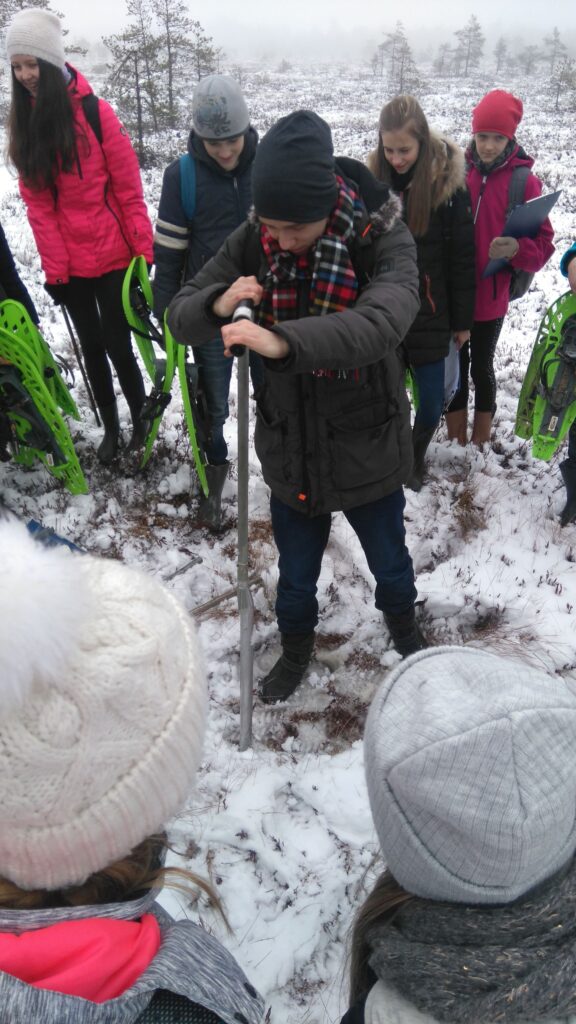 Saime väga ruttu aru, et meil on giidiga vedanud. Kes oleks arvanud, et turbaproovide võtmine ja turba olemusest jutu kuulamine võib olla kooliõpilastele äärmiselt huvitav ja kaasahaarav? Kui jõunumbrid esitatud (turbapuuri maasse surumine nõuab tugevust) ja esimesed „ah-kui-pehme-ja-sügav-see-maapind-on-emotsioonid saadud, panime jalga räätsad ja hakkasime õõtsuval tasapinnal liikuma, täpselt nagu suur pingviinide grupp – tasakesi, jalgu pigem lohistades.
