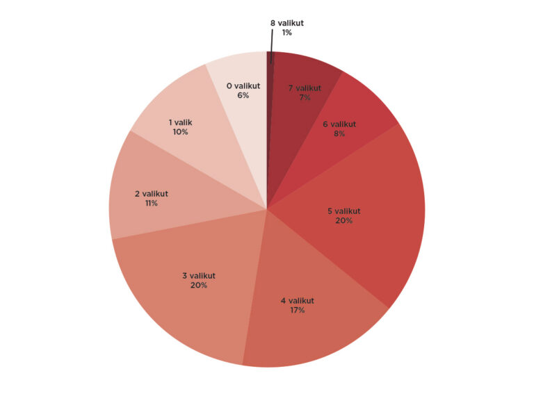 PISA 2015 andmebaas ei võimalda näidata, millise väitega iga kool täpselt nõus oli, küll aga võimaldas üldistada, mitme väitega koolijuht nõustus. Järgnev sektordiagramm kirjeldab koolijuhtide jaatavate vastuste sagedust. Ilmnes, et kõikidest uuringus osalenud koolidest ainult kahe gümnaasiumi juhid (1%) vastasid kõigile kaheksale väitele jaatavalt. Seitsme väitega nõustus 7% uuringus osalenud koolijuhtidest ja nende hulgas oli nii gümnaasiumi kui ka põhikooli juhte. Ühe väitega nõustus 10% ning ühegi väitega ei nõustunud 6% koolijuhtidest.