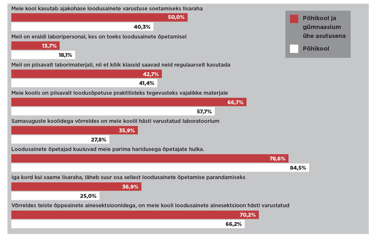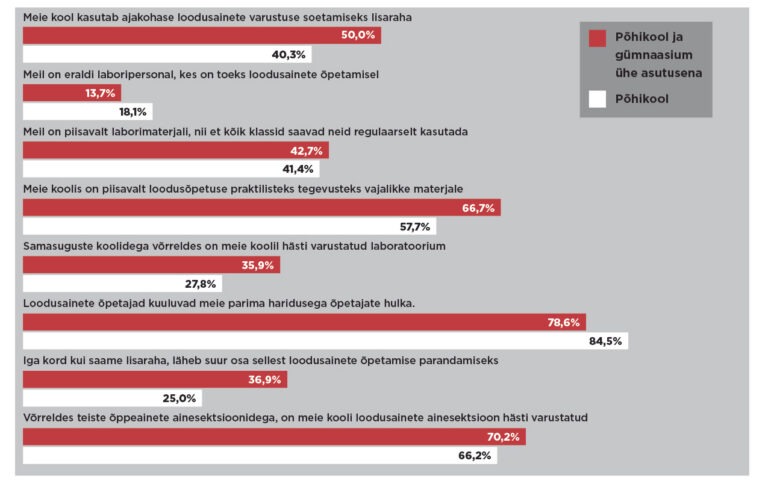 Eesti koolijuhid (66%) väitsid aga OECD keskmisest (78%) harvemini, et koolis on piisavalt praktilisteks tegevusteks vajalikke materjale. Nad väitsid ka tunduvalt harvemini (43% vs. OECD 66%), et neil on piisavalt laborimaterjali, nii et kõik klassid saavad neid regulaarselt kasutada. Samuti väitsid Eesti koolijuhid harvemini (35% vs. OECD 62%), et samasuguste koolidega võrreldes on meie koolil hästi varustatud laboratoorium. 34% OECD ja ainult 17% Eesti ning 3% Soome koolijuhtidest teatasid, et neil on eraldi laboripersonal, kes on toeks loodusainete õpetamisel.