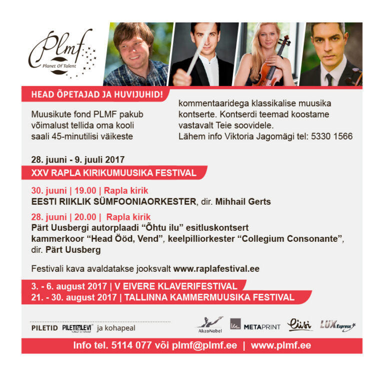 Festivalidega käsikäes korraldame sel suvel noortele keelpillimängijatele, lauljatele ja pianistidele suvekoole, kuhu registreerimise kohta anname jooksvalt infot meie kodulehel www.plmf.ee.