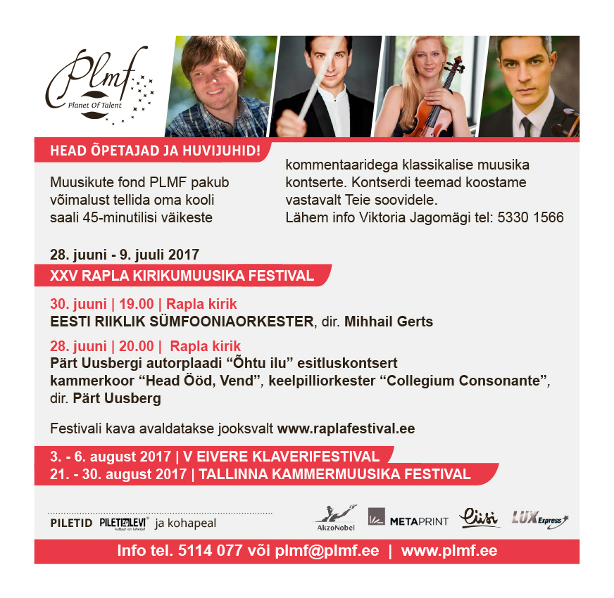 Samal ajal kui koolirahvas teeb ettevalmistusi suvepuhkuseks, alustab muusikute fond PLMF suvefestivalidega toimetamist. 28. juunil algava XXV Rapla kirikumuusika festivali peaesineja on Eesti riiklik sümfooniaorkester. Kontsert toimub 30. juunil kell 19 Rapla kirikus, solistiks tippviiuldaja Anna-Liisa Bezrodny ja dirigendipuldis noorema põlve üks andekamaid muusikuid Mihhail Gerts. Lisaks paljudele suurepärastele kontsertidele on publikul Rapla kirikus võimalus osa saada noore Raplamaalt pärit helilooja Pärt Uusbergi autoriplaadi „Õhtu ilu” esitluskontserdist. Festival kestab 9. juulini.