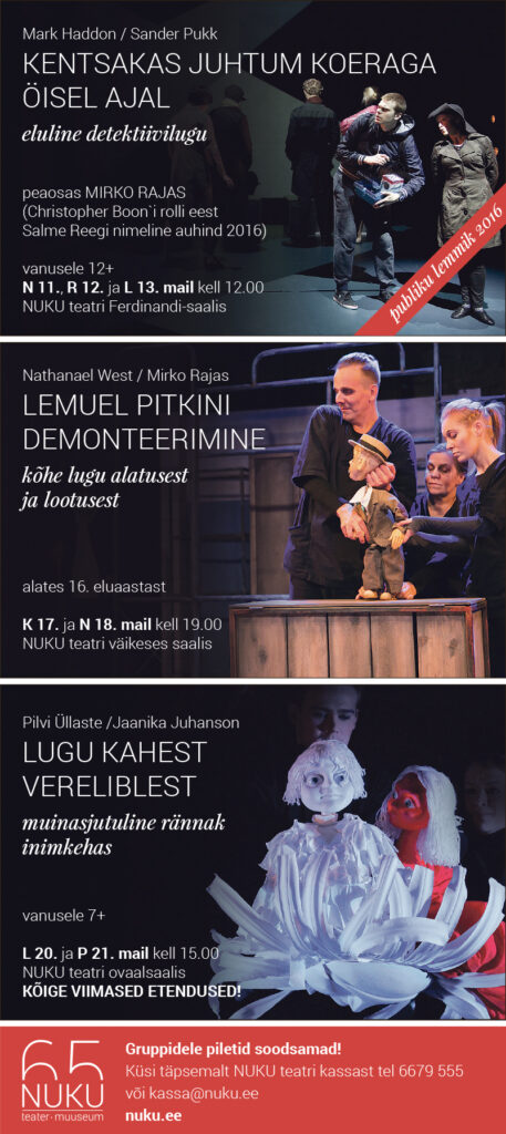 Ka 1. juuni õhtul Ferdinandi saalis etenduv prantsuse-norra lavastus „Tuhk” on mõeldud gümnasistidele ja täiskasvanutele. Laval rullub lahti tõestisündinud lugu püromaanist. Lavastusega on soov lasta publikul kogeda nähtamatut – piiri normaalsuse ja hullumeelsuse, loomise ja hävitamise vahel. Peatselt NUKU teatri kunstilise juhi ametisse asuv Mirko Rajas on öelnud, et „Tuhk” lummas teda erakordse mängutehnikaga ning jutustatud lugu puudutas hinge ja nähtud mäng inspireeris vaimu.