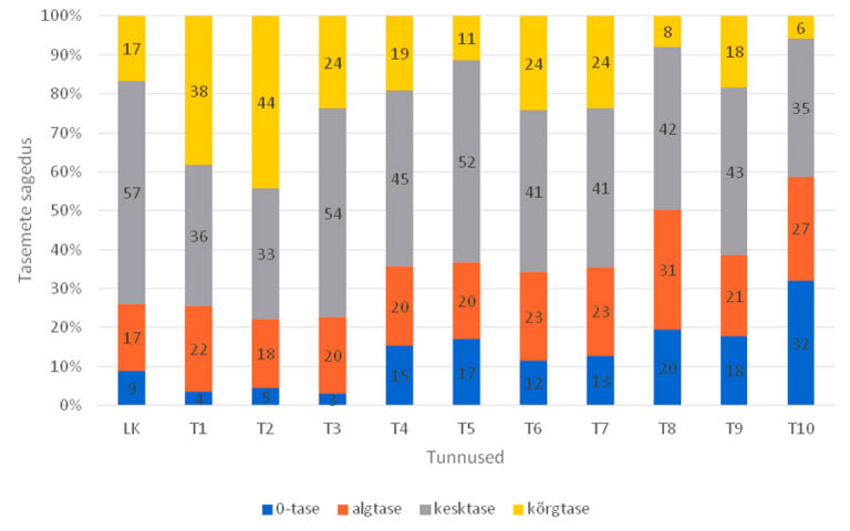 Kui vaadata kõigi katselise tasemetöö teinud 4. klassi õpilaste tulemusi koos, siis näeme, et üldiselt on õpilaste loodusteaduslik kirjaoskus algtasemel (vt joonist), kuid kahe tunnuse osas on saavutatud kesktase. Need on oskus kasutada korrektselt loodusteaduslikke mõisteid, sümboleid ja ühikuid ning arusaamine loodusteaduslikust tekstist või ise lihtsa loodusteadusliku teksti loomine. Kõige enam vajab arendamist tunnusprobleemi leidmine mingist situatsioonist ja selle korrektne sõnastamine. Selle tunnuse puhul on kesktaseme saavutanuid ainult 21% ja koguni 37% on nulltasemel. Keeruliseks osutus loodusteadusliku infot analüüsimine ja tõlgendamine ning selle põhjal asjakohaste järelduste ja otsuste tegemine, aga ka uurimisküsimuse ja hüpoteesi sõnastamine.