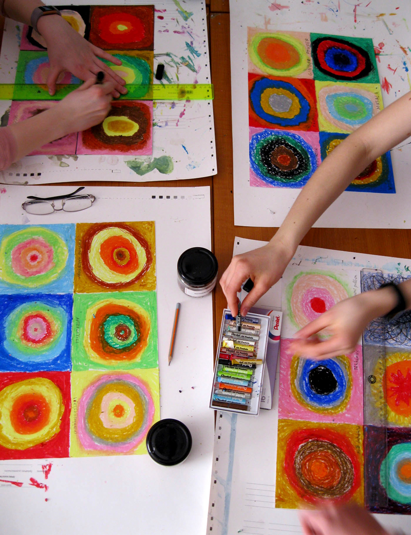 Õpetaja näitab abstraktse kunsti olemuse selgitamiseks Vassily Kandinsky 1913. aastal valminud kompositsioone, mis sündisid kunstnikul muusikat kuulates.
