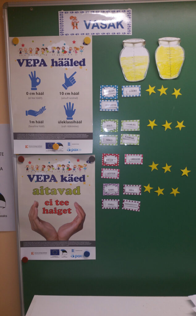 Esimesel kuul tegime tasapisi tutvust VEPA-vidinatega: harjusime suupilliga, katsetasime SOBIB-/EI-SOBI-kaarte; jälgisin, kuidas mõjub lastele võistlus taimeriga. Esmakordselt tunni alguses suupilli välja võttes olin pisut ärevil: kuidas lapsed reageerivad? Mängisin ja tõstsin kaks sõrme üles. Ja lapsed, kõigi uudishimulik pilk minul, tõstsid samuti kaks sõrme.