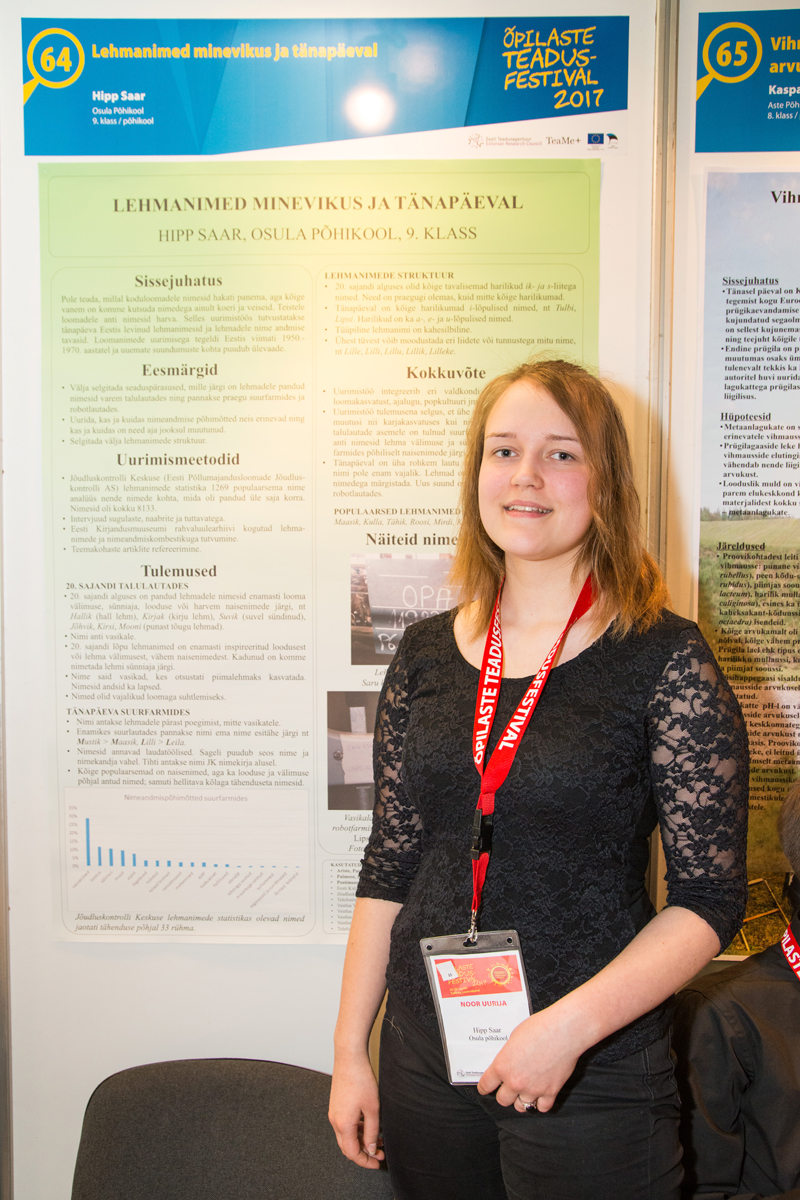 Osula põhikooli õpilase Hipp Saare stendi ees oli pidevalt rahvast tunglemas ja küsimas. Tema uurimistöö teema tõi vanematele külastajatele ilmselt lapsepõlve meelde: „Lehmanimed minevikus ja tänapäeval”. Uurimisöö pälvis põhikooliastmes II preemia ja Eesti kirjandusmuuseumi eripreemia. Juhendajad olid Mariko Faster Võru instituudist ja Merlin Mürk Osula põhikoolist. II preemia said veel Roosmarii Sarapuu ja Liisa Õunpuu Saaremaa ühisgümnaasiumist töö „Tumepunane neiuvaip (Epipactis atrorubens): bioloogia ja levik Saare maakonnas” eest.