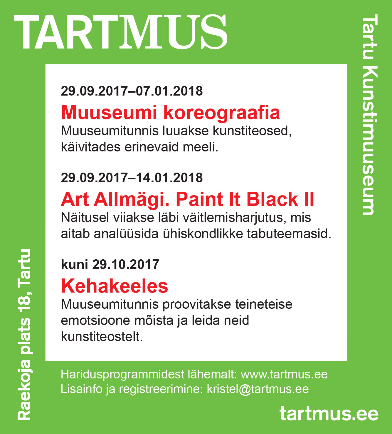 Muuseumi kõigi näituste, haridusprogrammide ja töötubade kohta loe infot muuseumi kodulehelt www.tartmus.ee.