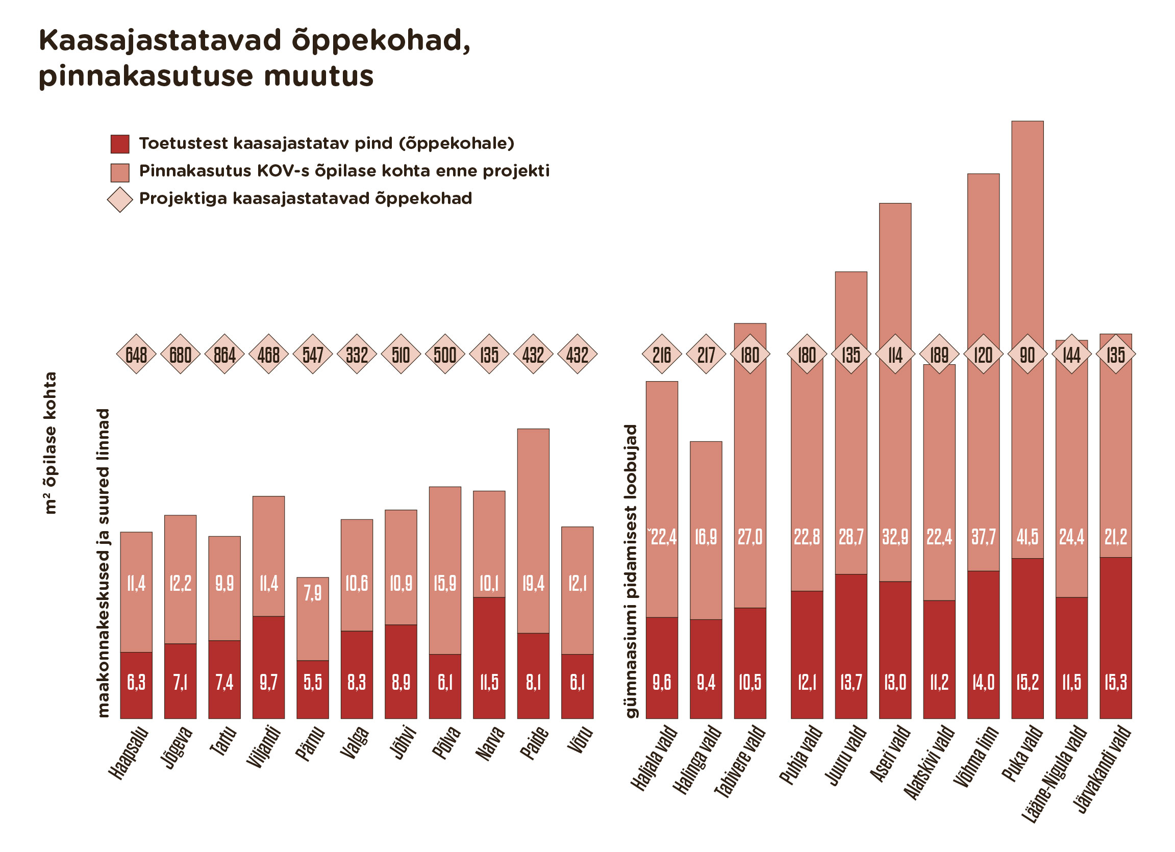 Meie koolimajad on valdavalt ehitatud ajal, mil aastas sündis paarkümmend tuhat last, kuid sündimus on kahanenud ja ootamatut tõusu prognoositud pole. Võrreldes eelmise sajandi lõpuga on õpilaste arv langenud ligi 40%. Hariduse vallas on praegu kasutada ligi 3,5 miljonit ruutmeetrit pinda, millest ligi pool kuulub üldhariduskoolidele. Aastaks 2020 on plaanis vähendada seda 3 miljoni ruutmeetrini.